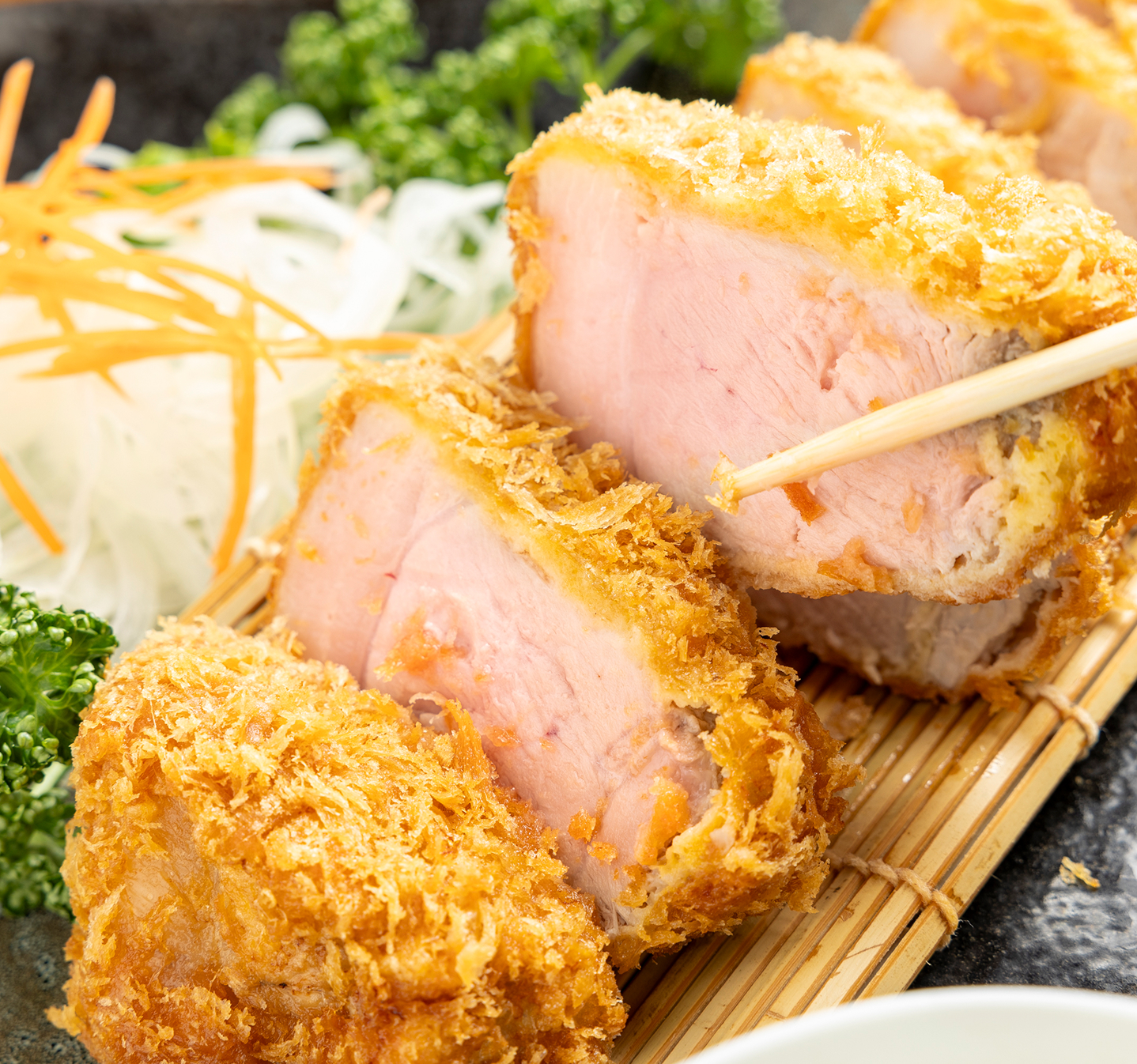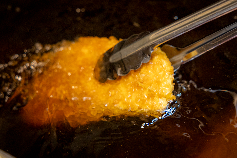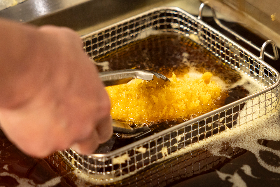 数々の豚肉を扱ってきたマスターに、常陸の輝きの魅力を伺うと「とっても美味しい豚肉ですよ。とにかく脂の質が違います!」と太鼓判を捺します。そんな常陸の輝きを使ったロースかつは、まずはシンプルに塩で味わってみてください。とんでは下味をつけずに植物性オイルであっさりと揚げているので、常陸の輝き本来の味わいをダイレクトに感じることが出来ます。常陸の輝き特有の上質な脂は口当たりも良く、さっぱりとした後味で食後の余韻まで幸せになれること間違いなしです。