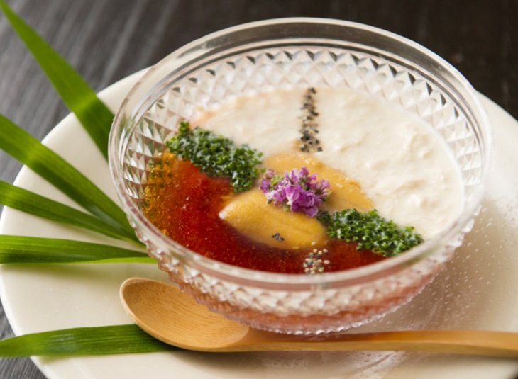 江戸の文化と伝統が今も息づく街、日本橋。「日本橋ゆかり」は、昭和10年創業の、日本橋の中心部にある老舗割烹店です。現在腕をふるうのは、3代目・野永喜三夫さん。村田吉弘氏の営む京都の名店「露庵 菊乃井」で修業を積み、現在は「日本橋ゆかり」の暖簾を守っています。 店内1階には、目の前で職人の技や会話が楽しめるカウンターやテーブル席、小上がりがあり、地下には個室、広間もあります。 店のコンセプトは、『温故知新』。店の設計やロゴデザインにも携わり、ビアージョッキも自ら作るなど、野永さんの“料理”は、調理だけに留まりません。 「料理人なんて、調理するのはあたり前。割烹のカウンターはショータイムです。魅せる場であり、伝える場です。日本料理の伝統を守りながらも、多方面で新しいことを発信したい。」と野永さん。 野菜を水で“炒める”調理法の開発など、驚くような発想と応用を得意とする野永さん。自ら監修した、「ヨネビシ醤油の干し椎茸の万能ソ-ス」は「調味料選手権2015」で優秀賞を受賞するなど、その発想は、料理法だけでなく商品開発などにも広がり、その独自の発想から生まれる新しいアイディアは、国内外からも注目されています。 ※右写真4枚目…「トマトのすり流し(2,650円)」野永さんの発想が光る、日本橋ゆかりを代表する一品。トマトを使ったすり流しの上に、かつおだしを重ねた二層仕立てのジュレ。上には汲み上げ湯葉のソースと海水漬けの紫ウニが載る。最初は二層それぞれを味わい、その後すべてを混ぜると“和風のガスパチョ”へと味が変化する。