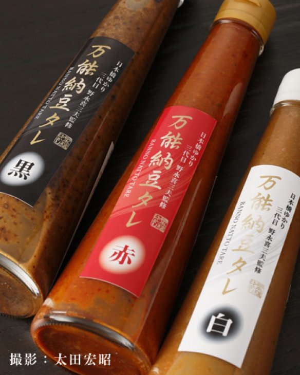 「茨城の食材はよく使っています。笠間市の小田喜さんの栗は毎年おせちで使っていますし、メロンの時期には、鉾田市の長洲さんのメロン、イチゴの時期には鉾田市の村田農園さんのイチゴも使っています。醤油も、常陸太田市のヨネビシ醤油さんを使っています。僕は、熱意とこだわりのある生産者の食材を使いたいので、作り手の想いを直に感じるために、現地に行くことも多いです。」と野永さん。作り手の想いを感じ、食の旬を見極めて、食材の“はしり”、“旬”、“なごり”を活かした料理を提供しています。 また、野永さんは、日立市の“菊水食品”の納豆を使った「万能納豆タレ」を監修し、世界に発信しています。 「菊水さんから、納豆を店で使ってくれないかと相談があったんです。納豆自体を店で使うのではなく、僕には納豆を使った新商品のアイディアがあったので、“納豆タレ”を開発しました。納豆は、人によってはにおいと粘りがネックです。それをうまいこと中和してやれば、おいしいタレができるんです。菊水さんは、管理が行き届いた環境で納豆を作るから、納豆自体のにおいが繊細。この納豆だからこそ、うまいタレができますね。」日本橋ゆかりのコースのお刺身には、必ず、醤油と納豆タレの2種類がつきます。「納豆タレには、大豆本来のうまみがあるから、魚や肉とすごく相性が良い。特に外国の方には好評です。」 「日本人は、海外のレセプションやイベントで、納豆をそのまま出そうとしたりする、これじゃ誰も食べません。パスタやバケットなど、その地域に根差している食材をベースに、そこに納豆タレを添える。そういう応用が必要なんです。」 このタレは、日本のみならず、海外でも試食を行い、評判を呼んでいます。