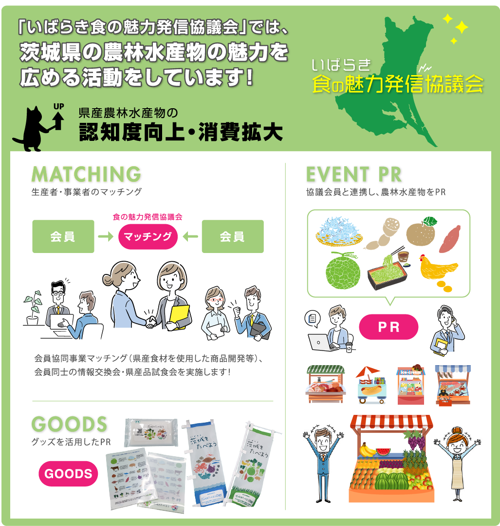 協議会では、茨城県の農林水産物及びその加工品等を広く県内外に発信することに積極的な企業・団体の入会を募集しています。