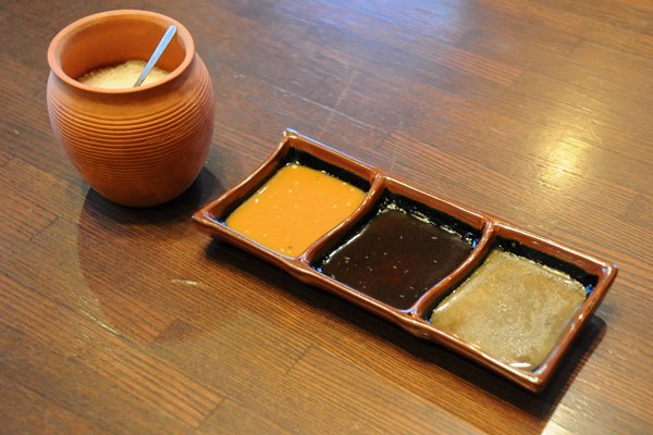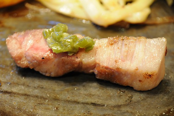 土浦市は、出荷量日本一を誇る蓮根(れんこん)の大産地。クックバーンでは、この土浦の蓮根を食べて育ったこだわりの豚肉「蓮根豚」のステーキが味わえちゃうんです。いただいたところ、クセが無く脂身があっさりとしていて、甘い! クックバーンのソースは通常、ゴマ、ガーリック、ビネガーの自家製ソース3種類に特選塩を加えた4種類なのですが、蓮根豚にはそれに「きざみわさび」も付きます。蓮根豚には、特選塩を付けて、きざみわさびを少し乗せて食べると、蓮根豚の甘みとわさびの風味が絶妙にマッチしてオススメです。