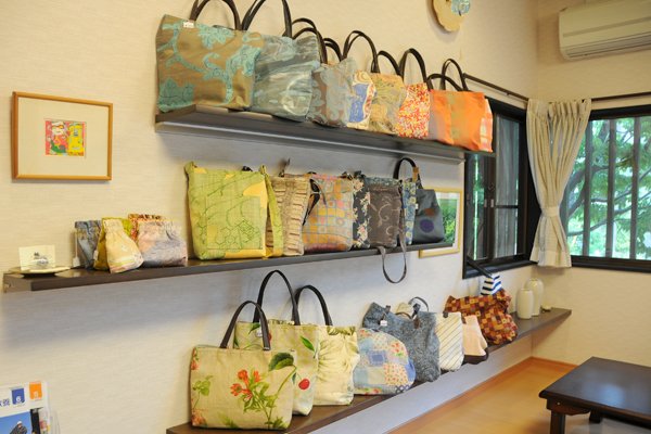 自宅を改築したという店内は明るく家庭的な雰囲気。大きな窓から見える日本庭園が美しいです。入ってすぐ左側にはデザインアートバッグが展示してあります。よく見ると店内の端々に陶器類もちらほら。どうやら店内はアートギャラリーでもあるようで、人脈の広いご主人の人柄がうかがえます。