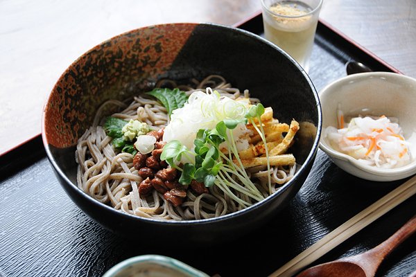 麓の代名詞とも言える看板メニュー『ぶっかけ納豆そば』は、つるつるシコシコのそばの上に山形県産の紅大豆からできた納豆「茶々丸」、大根おろし、カイワレと、近所の豆腐屋から仕入れた油あげが乗った、つゆをぶっかけて混ぜていただくタイプのそばです。「茶々丸」は大粒で見た目にインパクトはありますが、食べてみると決して主張しすぎず、そばの風味をより引き立たせる役割となっています。これに大根おろしの辛味と、外はパリッ、中はしっとりとした油揚げのコンビネーションが更に食欲をそそります。 また、そばだけでは足りない…という方には、野菜天せいろがオススメ。その名の通り、野菜のみの天ぷらですが、旬の地元産野菜が常時6種類も入っています。