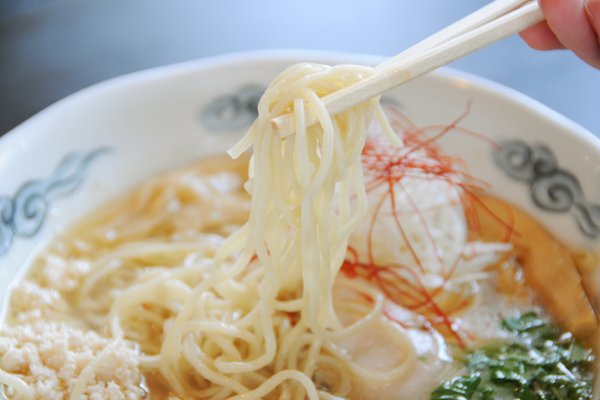 「龍のひげ」にはスープの他にもうひとつ大きなこだわりがあります。それはスープに合わせて作った個性的な自家製麺です。麺の種類は、細麺・中太麺・太麺の三種類。なかでも、龍のひげ塩・醤油らぁめんで使用している中太麺は、製粉業界では有名な粉の「傾奇者(かぶきもの)」とパスタでよく使われる「デュラムセモリナ粉」をブレンドしているそうです。さすが元イタリアンシェフの発想ですね。「デュラムセモリナ粉」をブレンドすると、もちもち・ぷりぷりかつ歯切れの良い食感に仕上がり、来栖さん曰く、「ラーメンにとても合う!」そうです。