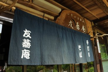 桜川市の大自然に囲まれた山の中にたたずむ「いきいき里山 友蕎庵(ゆうきょうあん)」。 「もともとこの場所は退職後の楽しみとして自然あふれる環境の中で果物を作ったり 趣味のそば打ちをして友人に振る舞ったりしたいと購入したもの。」と話す店主の飯村 泰雄さん。 はじめは友人たちの集まりの席でのみ披露していたそばでしたが,そのおいしさで 徐々に評判を呼び,周囲の勧めもあり開業を決意。 趣味が高じて2012年6月に蕎麦屋をオープンさせました。