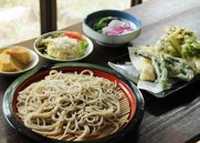 もともとそば打ちを趣味にしていた店主。おいしいそばをお客様に振る舞いたいという気持ちから、そば粉を探しましたが、なかなかおいしいそば粉を見つけられなかったそうです。 そんな時にそば打ち仲間に紹介してもらったのが「常陸秋そば」でした。 友蕎庵に入る道の入口には、小規模ながら立派な常陸秋そばの畑があります。これは店主自身で栽培しているもの。友蕎庵で提供されるそばは、半分は石臼挽き、もう半分はロールで挽いているそうで、つるつると喉に入っていき、細切りながらもコシのある食感を楽しむことができます。 一番の人気メニューは「おまかせセット」です。冷たいそばに季節の野菜を使った天ぷらと厚焼き卵、漬物等の小鉢、食後にコーヒーとデザートが付いた大変ボリュームのあるメニューです。 (おまかせセットは4名様から受け付けています。)