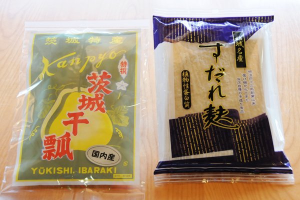 特におすすめはローズポークのかつ丼で、甘味のあるジューシーなローズポークと、甘辛のタレが絶妙にマッチ。ごはんがどんどん進みます。手打ちそばとセットで注文すると、手打ちそばとローズポーク両方のおいしさが楽しめるので、『つむぎ定食』が一番人気なのは納得です。 おなかがいっぱいになったら、レストランの隣に併設されている物産館にレッツゴー。郷土料理であるすだれ麩や干瓢(かんぴょう)をはじめ、つむぎうどん、地酒、菓子など結城の名産品が所狭しと並んでいます。
