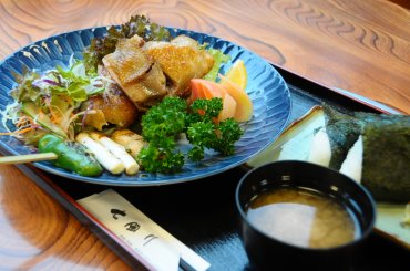 「和風レストラン 七曲り」の一押しメニューは、奥久慈しゃもの焙り焼き。フランスのジビエ料理にヒントを得て、低温の油で長時間かけて煮込んだ後、焙った奥久慈しゃもは、ジューシーに仕上げられており、奥久慈しゃもを味わうには最高の一品です。 一人前で、かなりボリュームがあります。おにぎりセットと一緒に注文して、豪快に食べるのがおすすめです!