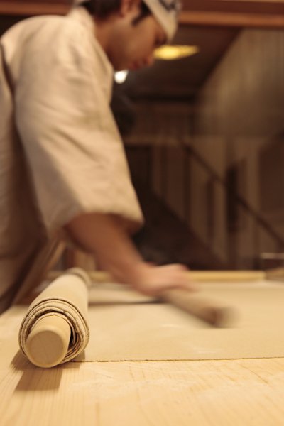 うまい酒造りにはかかせない"おいしい水"。木内酒造の敷地内には、蛇口をひねれば酒蔵と同じ清らかな水が出てくるため、【蔵+蕎麦 な嘉屋】では、すべての料理の全行程でこの水が使用されています。 毎日数量限定になりますが、酒だけで打った「酒蕎麦」酒蔵ならではの人気メニューです。 香り高い常陸秋そばを打つ際に、味わい深い純米酒を加えることで奥深い味わいが生まれています。 「蔵+蕎麦 な嘉屋」の外一(そば粉十に対してつなぎ一)で手打ちした蕎麦は細く、のどごしがよいのが特徴です。