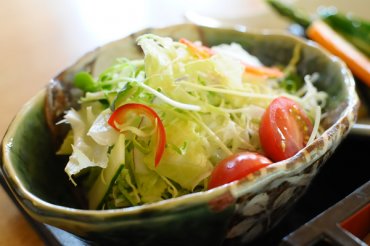 野菜たっぷりヘルシーメニューとして登場したのがヘルシーそば御膳(※要予約)です。小鉢が数品付くこのメニューは特に地産地消を心掛けています。 天ぷらよりもカロリーをおさえられる素揚げにした野菜やサラダには自家栽培の野菜を中心に、地元の野菜をふんだんに使用。また、ゆばは奥久慈ゆば、温泉卵も奥久慈卵、デザートの杏仁豆腐にも、大子のりんごを使って作ったりんごのジャム(季節によって変わります)がのっているなど徹底した地産地消っぷりです。