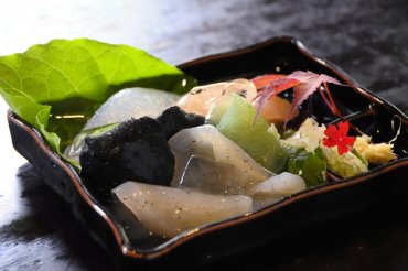 期待を膨らませながらメニューを見ると、大子ならではの「さしみこんにゃく」の文字に心を動かされ、まずはさしみこんにゃくをオーダー。こんにゃくの刺身…想像したのはいつも食べる味噌田楽の食感でした。 運ばれてきたお皿の中には、まるで活魚の刺盛のように様々なこんにゃくが盛りつけられています。緑は青海苔こんにゃく、ピンクはトマトこんにゃく、黒は竹炭こんにゃくとのこと。 御箸で持った瞬間、想像以上に柔らかくてびっくり。プルプルした食感にも驚きました。こんにゃくごとに、それぞれ食感に違いがあり楽しめる一皿です。 小林さんに聞くと、地元の農家と契約して作っている手作りこんにゃくだということがわかりました。お店の外で売られているこんにゃくは、お持ち帰り必須です。