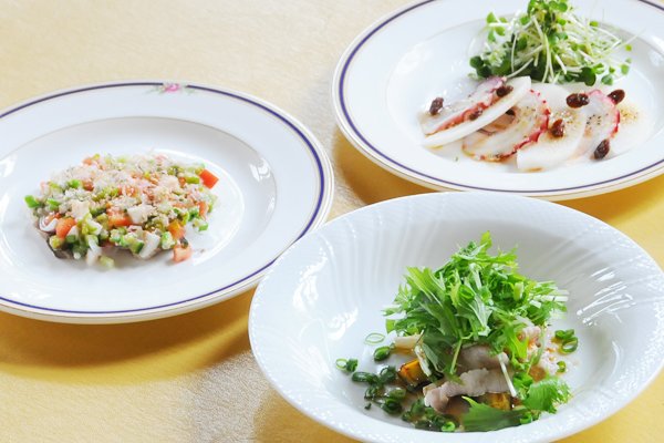 オススメは、期間限定の「梨とタコのカルパッチョ」。店主が目利きして仕入れた茨城県産の梨をスライスし、壺漁で獲れた新鮮なタコと合わせた前菜です。 梨は大ぶりにカットされており、シャキシャキ感はそのまま。梨とタコを一緒に食べると、梨からあふれ出る果汁と、肉厚でやわらかな食感のタコの旨味が相まって、口の中にじゅわわ~っと幸せが広がるおいしさです。ピリリと黒コショウの効いた自家製ドレッシングが味をまとめています。 「梨とタコのカルパッチョ」は、単品でも(¥800)、コースの前菜としても(¥1,980~)食べることができます。梨の旬である9月30日までの期間限定で提供中です。お近くにお越しの際は、ぜひお立ち寄りください!