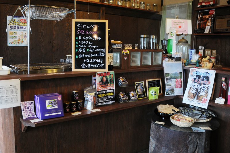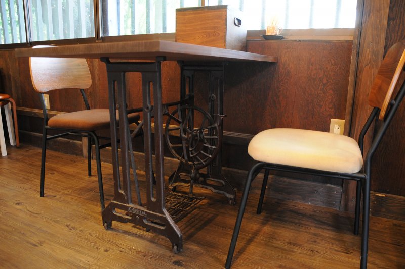 店内は、従来の「せんべい屋」のイメージを覆すようなおしゃれな雰囲気で、ご近所からいただいたという椅子や、店主の祖母が使っていたという「足ふみミシン」のテーブルなど、温かみのあるアンティーク家具が揃えられています。また、全卓に火鉢が置かれ、どこか童心に帰らせてくれるような佇まいです。