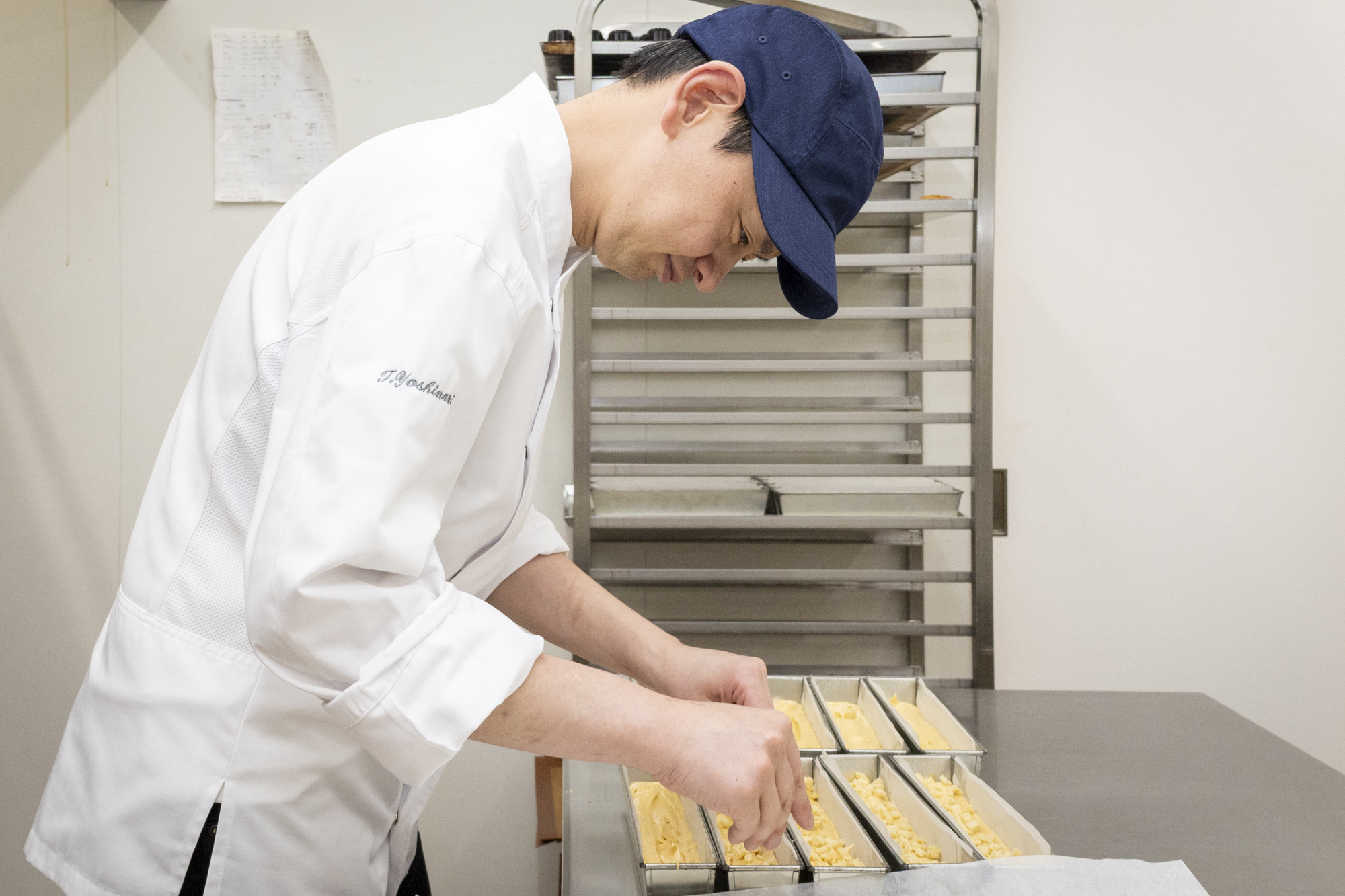 『ほくめい』というお茶のケーキには、スポンジ生地やガナッシュ、ムース、トッピングのチョコレートにまで、大子町にあるかねた園の奥久慈茶「ほくめい」の煎茶を使用するというこだわり!実際に茶園の方と話す中でヒントを得て生まれた一品です。丁寧にほくめいの香りを移すことで、奥行きのある苦みが生まれるそう。トッピングのクリームは、季節によって変化し、カモミール、新茶、ほうじ茶など、春夏秋冬異なる風味が楽しめるのも魅力のひとつ。煎茶ならではのほろ苦さと豊かな香りが広がる、まさに“大人のためのスイーツ”です。