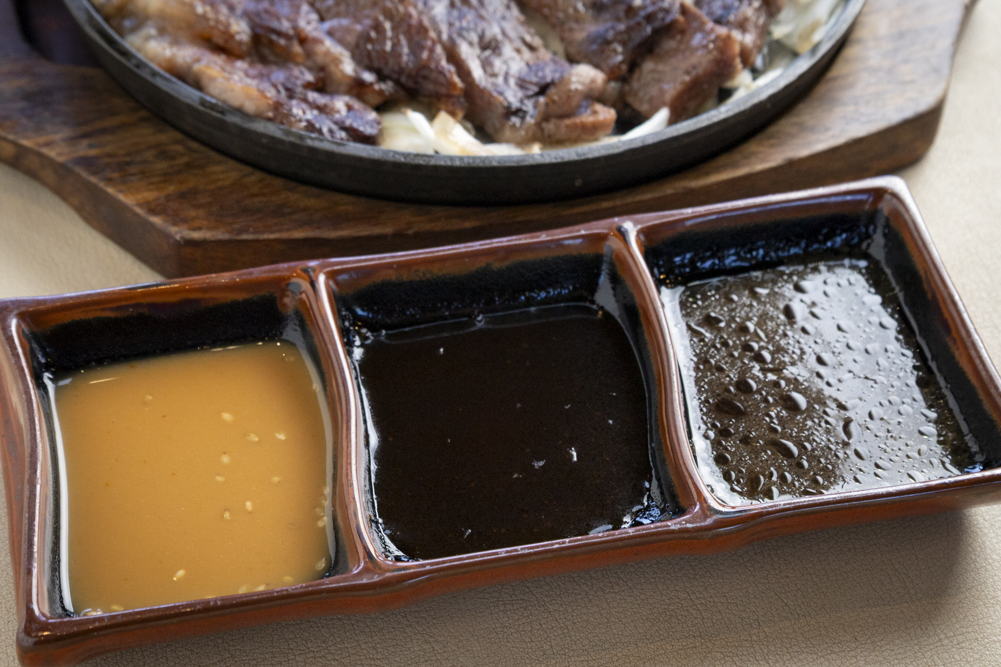 さらに、そんなサーロインステーキの美味しさを持ち上げてくれるのが、別添えで提供される3種類の手作りソースです。ひとつは甘めの濃厚ゴマダレソース。脂の乗った肉にコクをプラスしてくれます。よりコッテリと楽しみたい人におすすめです。そして、二つ目はガーリックソース。醤油ベースにニンニクの風味が効き、シンプルに味付けした肉に醤油のグルタミン酸の旨みが加わり、その風味を引き立てます。そして最後は爽やかな酸味のビネガーソース。ゴマダレソースとは対照的に、和牛の脂を酢の酸味で洗い流してくれるのでさっぱりとした後味が楽しめます。私はこのビネガーソースが一番のお気に入りでした‼