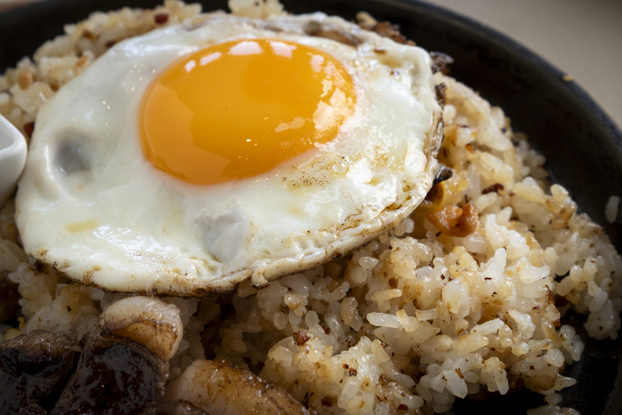 香ばしいガーリックライス付きの月見ステーキ