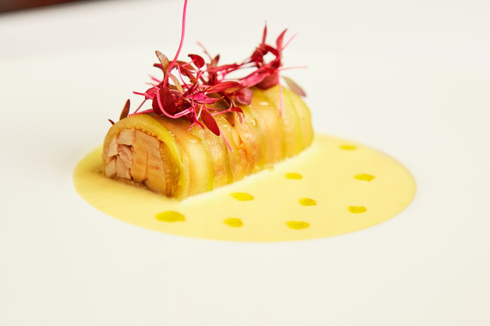 柔らかい肉質が特長のメスを使用。すっきりと脂肪分の少ない奥久慈しゃものムネ肉で作ったハムとクルマエビを並べて薄切りのズッキーニで包む。料理の美しい見た目も同時に楽しみたい。