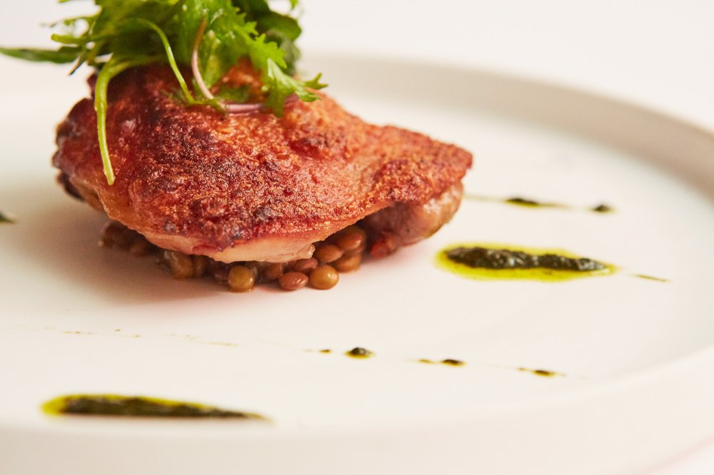 低温の油で中までゆっくりと火を通し、パリッと焼いてオーブンで仕上げた一品。茨城県産バジルのソースとクレソン、ベビーリーフなどが彩を添える。