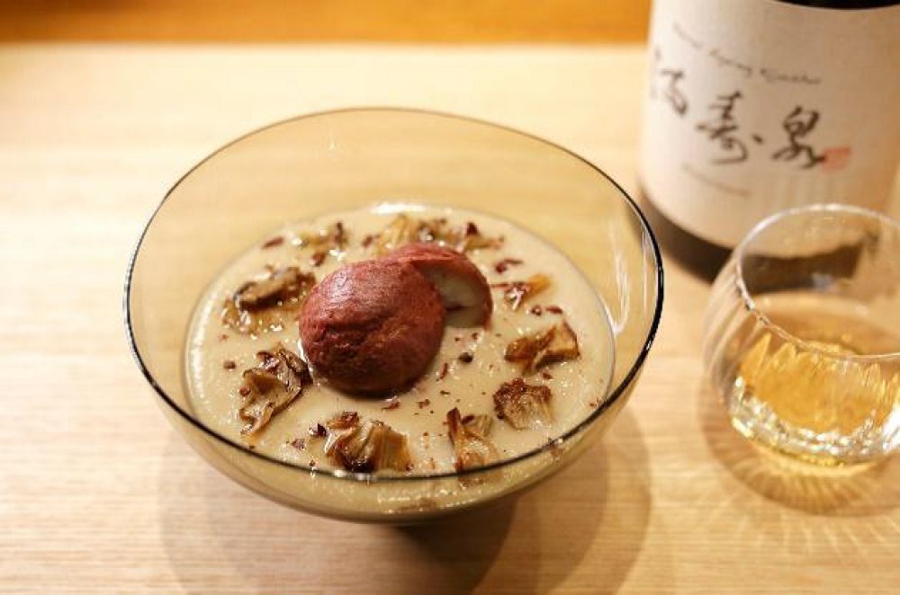 「七谷鴨赤味噌と椎茸のデュクセル 鬼皮と朴葉の燻製/岸根と鴨腿肉のパテ/飯沼栗とフォアグラ、トリュフ風味のクロメスキ」