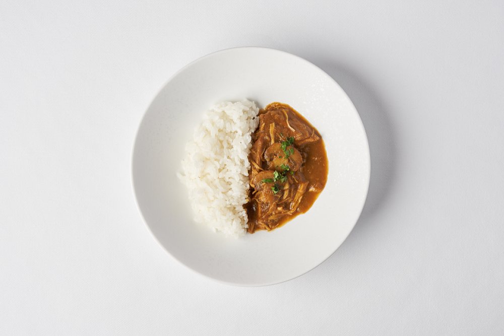 浦野シェフがまだ10代だったホテル修行時代に何度も作った伝統のカレーを、現代風にアレンジしながらグルテンフリーで再構築しました。奥久慈の長閑な山間地域で平飼いされる地鶏「奥久慈しゃも」を、ほろほろとほぐれるまで煮詰め、風味のよい美浦のマッシュルームがアクセントになっています。