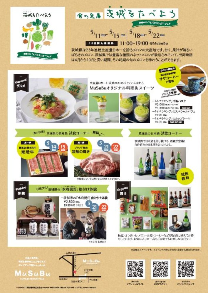 東京港区白金台プラチナ通りに位置するポップアップ型ショールーム「MuSuBu」で茨城県の⾷の魅⼒をとことん味わうポップアップイベント『⾷の宝庫 茨城をたべよう ―茨城メロン"イバラキング"フェア―』 が開催されます。