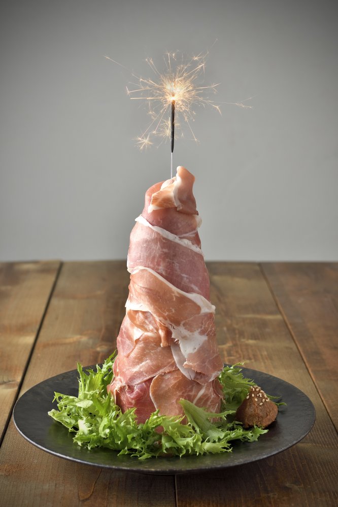 常陸牛コンビーフを混ぜ込んだマッシュポテトに、常陸の輝きの生ハムを巻き付けた“特製タワー”。