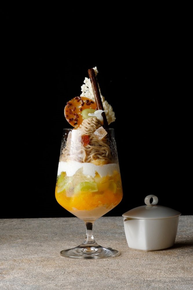 今秋収穫されたばかりの笠間産の新栗と秋のフルーツの味覚をお楽しみいただけるパフェです。中央に盛り付けた新栗のモンブランはほうじ茶の香ばしさを加え、バニラアイスとフロマージュブランを組み合わせました。グラスの下部には、洋梨やシャインマスカットといったフルーツと、キャラメル風味のチョコレートクリームを色彩豊かに重ねました。かりんとうやマロングラッセ、ホワイトチョコレートでコートしたライスパフなどを飾り付け、ラ・フランスのソースを添えてご提供します。