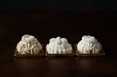 通常のマロンシャンテリーをミニサイズにし、一度に 3 種のフレーバーを楽しめるお得なセットです。東京會舘伝統の味の「マロンシャンテリー」(写真中央)のほか、アールグレイティーの芳香が広がる「マロンシャンテリー アールグレイ」(写真左)、洋梨果汁のフルーティーな甘さの「マロンシャンテリー ラ・フランス」(写真右)をご提供します。