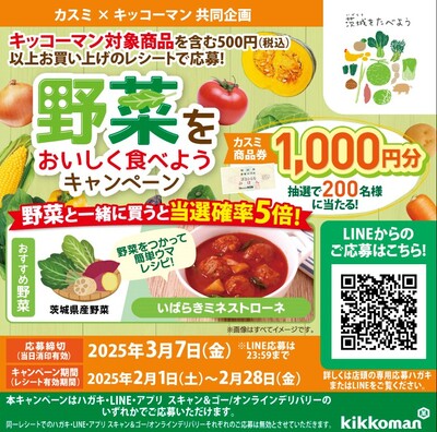 カスミ店舗でキッコーマン対象商品をお買い上げの客様に、カスミ商品券が当たるキャンペーンが実施します。