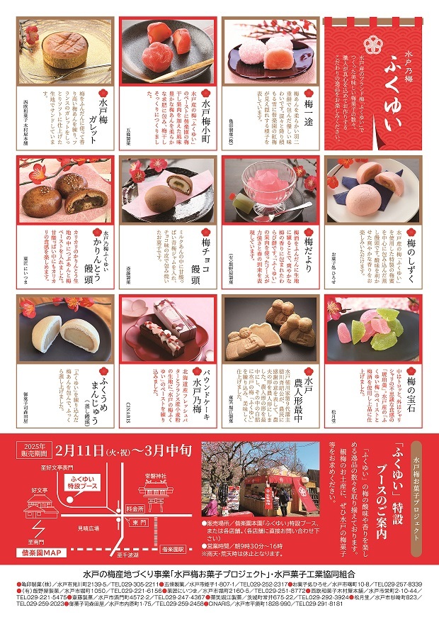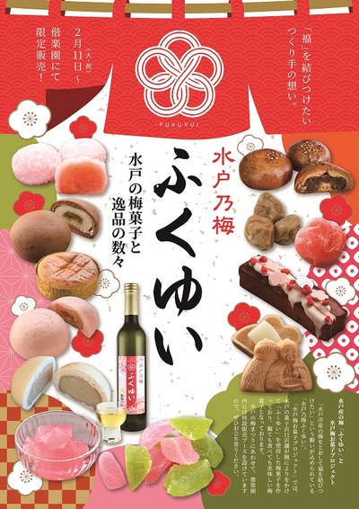 「水戸市産の梅をとおして福を結びつけたい」という願いが込められている「水戸乃梅ふくゆい」。「水戸梅お菓子プロジェクト」では、メンバーの各菓子店が腕によりをかけて「ふくゆい」を使用した梅菓子を作っており、観ても食べても美味しい梅菓子となっております。