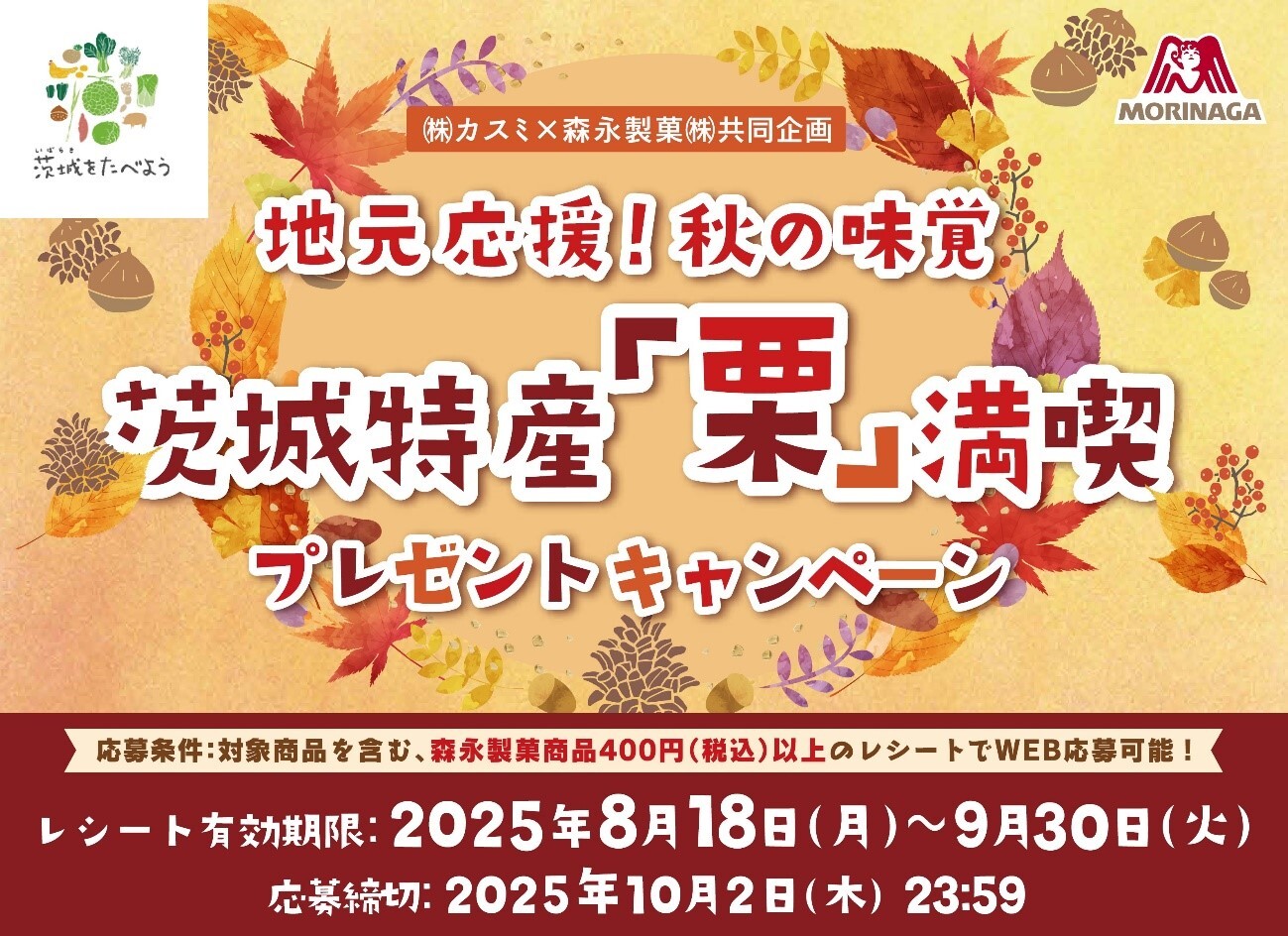 カスミ店舗で森永製菓対象商品をお買い上げのお客様に、抽選で、氷蔵庫で熟成させたとっても甘い茨城県産「むき栗400g」または「生産農家こだわりの栗商品」が当たるプレゼントキャンペーンが実施されます!