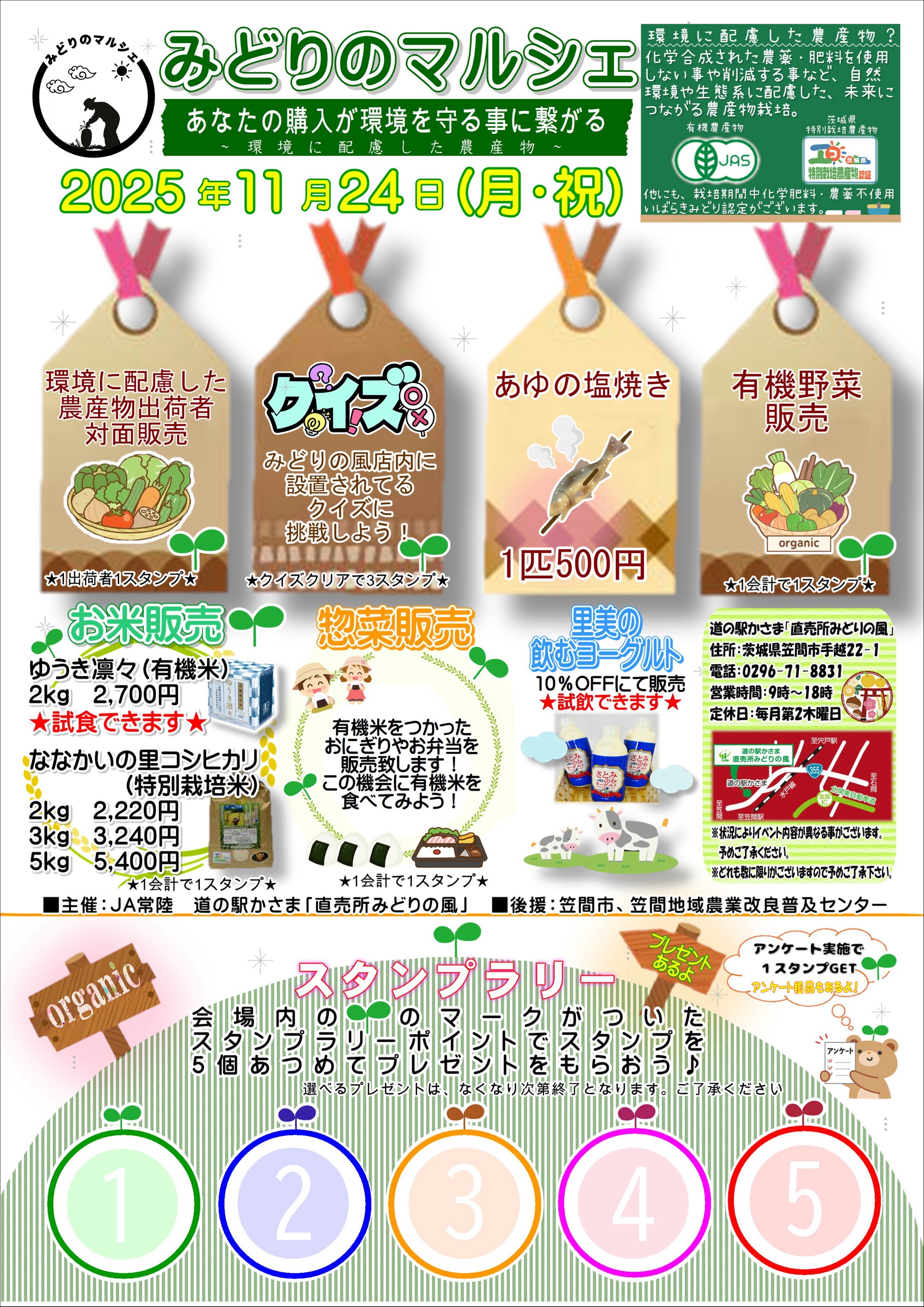 11月24日(月・祝日)道の駅かさま「直売所みどりの風」 みどりのマルシェ開催!(2025/10/30)