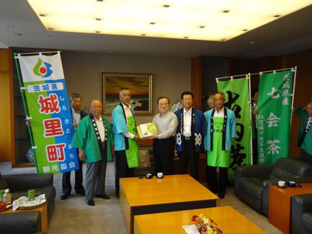 7月6日(金),城里町の阿久津藤男町長,JA水戸古内茶生産組合とJA茨城中央七会茶生産組合の代表など計11名の皆さんが県庁を訪れ,橋本知事に「古内茶・七会茶の新茶」を贈呈し,産地のPRを行いました。