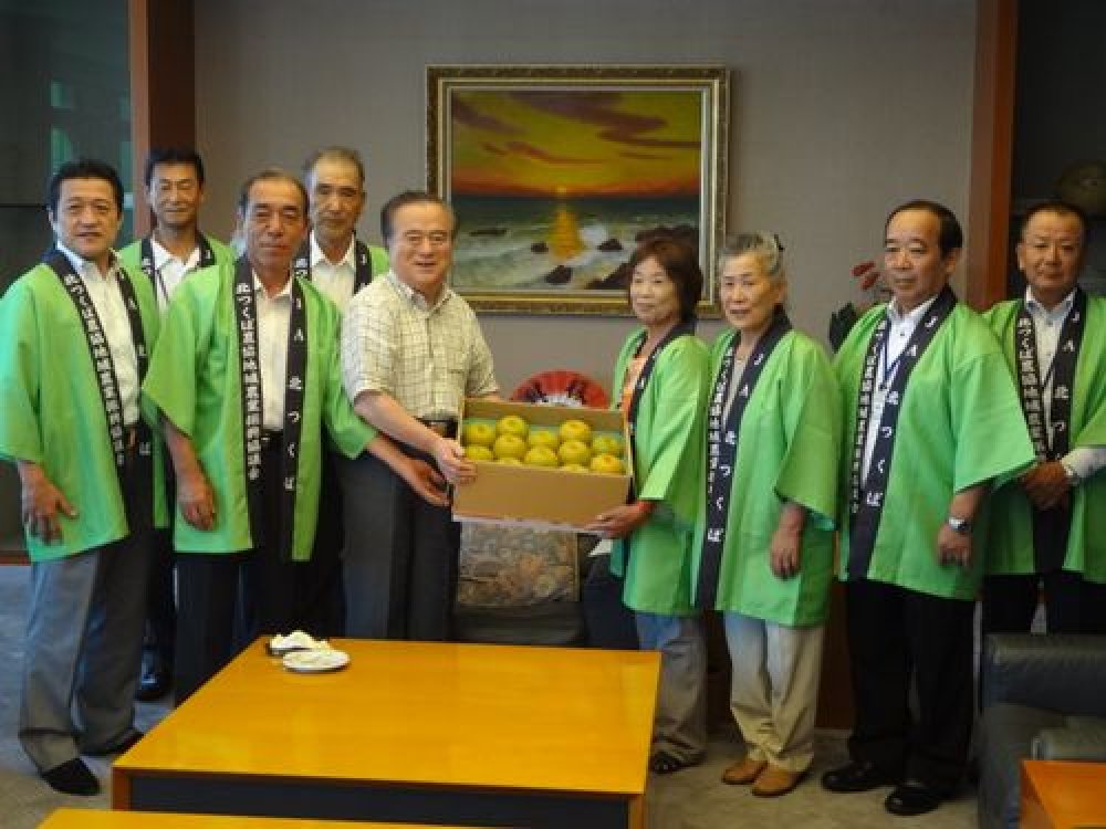 8月22日(水曜日)、筑西市の吉澤市長、JA北つくばの生産者の代表など計19名の皆さんが県庁を訪れ、橋本知事に出荷最盛期を迎えている梨(幸水)を贈呈し、産地のPRを行いました。