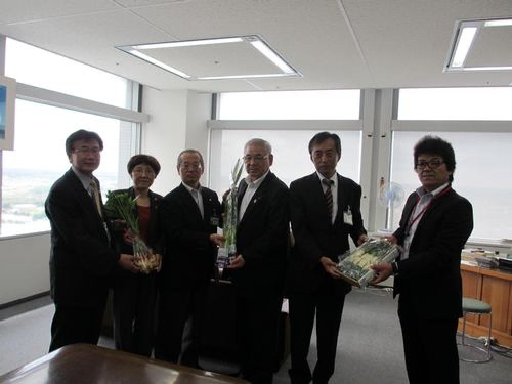 5月2日(木)、JAなめがたの中川代表理事組合長、邉田特命常務理事、千ヶ崎営農経済部長ほか4名のみなさんが県庁を訪れ、旬の産品である「葉菖蒲」、「葉しょうが」、「エシャレット」をPRしました。