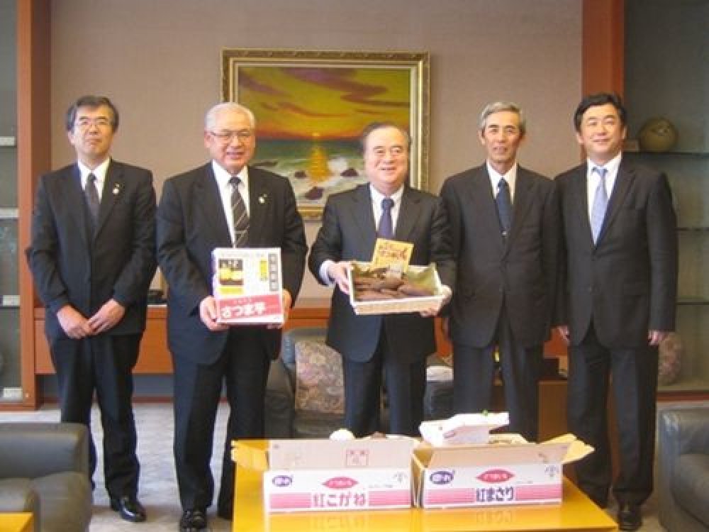 県庁を訪れ,特産品の「かんしょ」をPRしました。