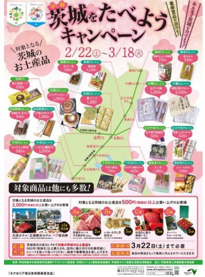 EVENT / 旬のうまいもの特集 新着・イベント情報 【茨城をたべようキャンペーン早春】 (2014/02/27) 2月22日(土)~3月18日(火)まで、ネクセリア東日本(株) 関東東支店主催で「茨城をたべようキャンペーン」が実施中です。 県内の各SA・PAで対象となる茨城のお土産品を500円(税抜き) 以上購入し、応募用紙にレシートを貼って送付した方の中から 抽選で豪華賞品があたるキャンペーンです。 日本を代表する梅の名所「偕楽園」や関東の名山「筑波山」の 梅林など、梅薫る春の茨城の魅力とあわせて、美味しいご当地土産 もお楽しみください。 今、おすすめの記事 {{row.type_jp}} {{row.title}}