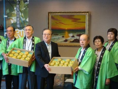 代表など計20名の皆さんが県庁を訪れ,橋本知事に旬を迎えた幸水梨を贈呈し,