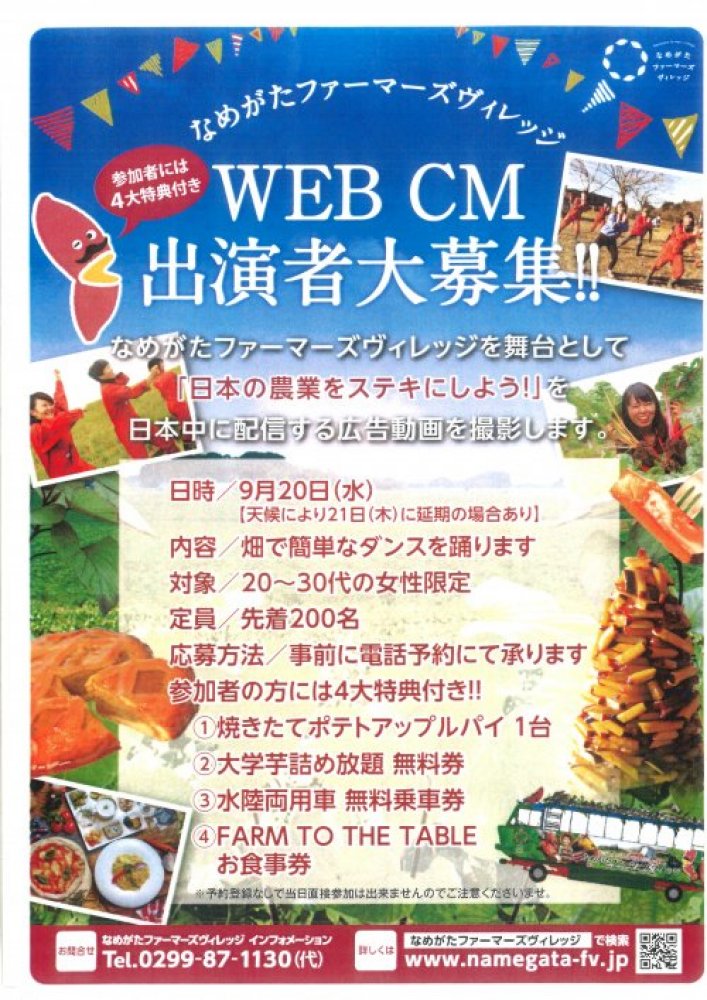 EVENT / 旬のうまいもの特集 新着・イベント情報 なめがたファーマーズヴィレッジ・WEB CMの出演者大募集!(2017/09/08) なめがたファーマーズヴィレッジでは、この度、CMを通して茨城県を広くアピールし認知度アップ等を図るため、広告動画(WEB CM)を撮影します。 つきまして、先着200名の出演者を大募集していますので、皆様お誘い合わせの上、どしどしご応募ください! 参加者には、焼きたてアップルバイなど、4大特典付き! ■詳しくは、なめがたファーマーズヴィレッジ インフォメーションまで 電話:0299-87-1130(撮影概要) 日時:9月20日(水) ※天候により、21日(木)に延期の場合あり 内容:畑で簡単なダンスを踊ります 対象:20〜30代の女性 定員:200名 応募:事前に電話予約 今、おすすめの記事 {{row.type_jp}} {{row.title}}