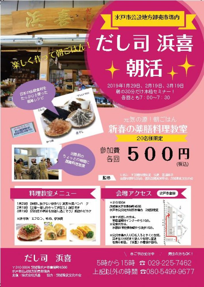 水戸市公設地方卸売市場内 だし司 浜喜の天然お出汁を使って、朝ご飯を作りながら日本の伝統食材を楽しく学びましょう。