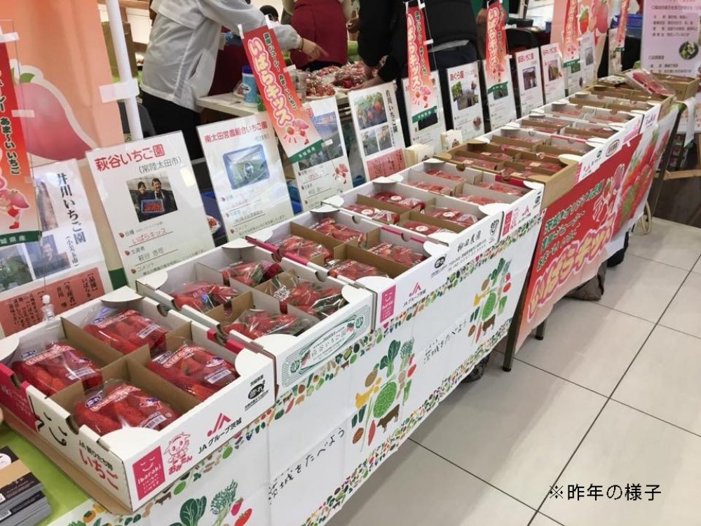 茨城県オリジナル品種のいちご「いばらキッス」など,いちごの試食販売を行います。いちごが当たる抽選会も行います。