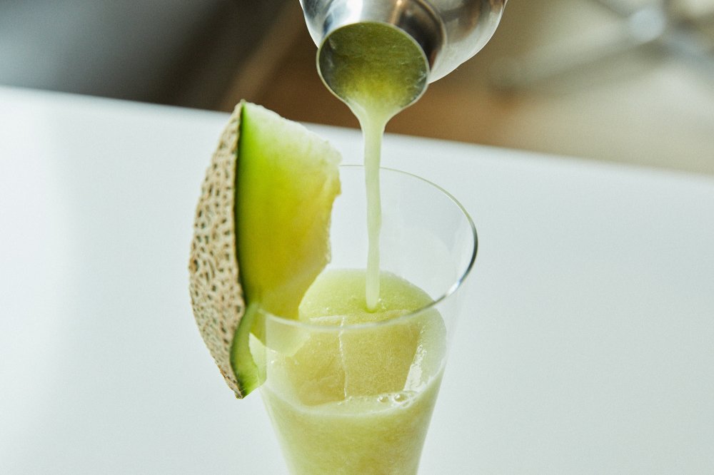 イバラキングを1/4個以上使ったぜいたくなひと品です。フレッシュ感あふれる果実やジュースに、すっきりおだやかな豆乳のブランマンジェ、シャーベットとバニラアイスクリーム、グラニテなどが混じり合い、キラキラと輝くスパークリングワインの粒ゼリーがアクセント。