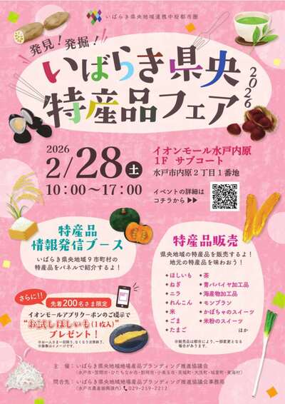 いばらき県央地域9市町村の特産品のパネル紹介や、特産品の販売、イオンモールアプリ会員限定「お試しほしいも(1枚入)」プレゼントなどを行う「いばらき県央特産品フェア2026」を開催します。