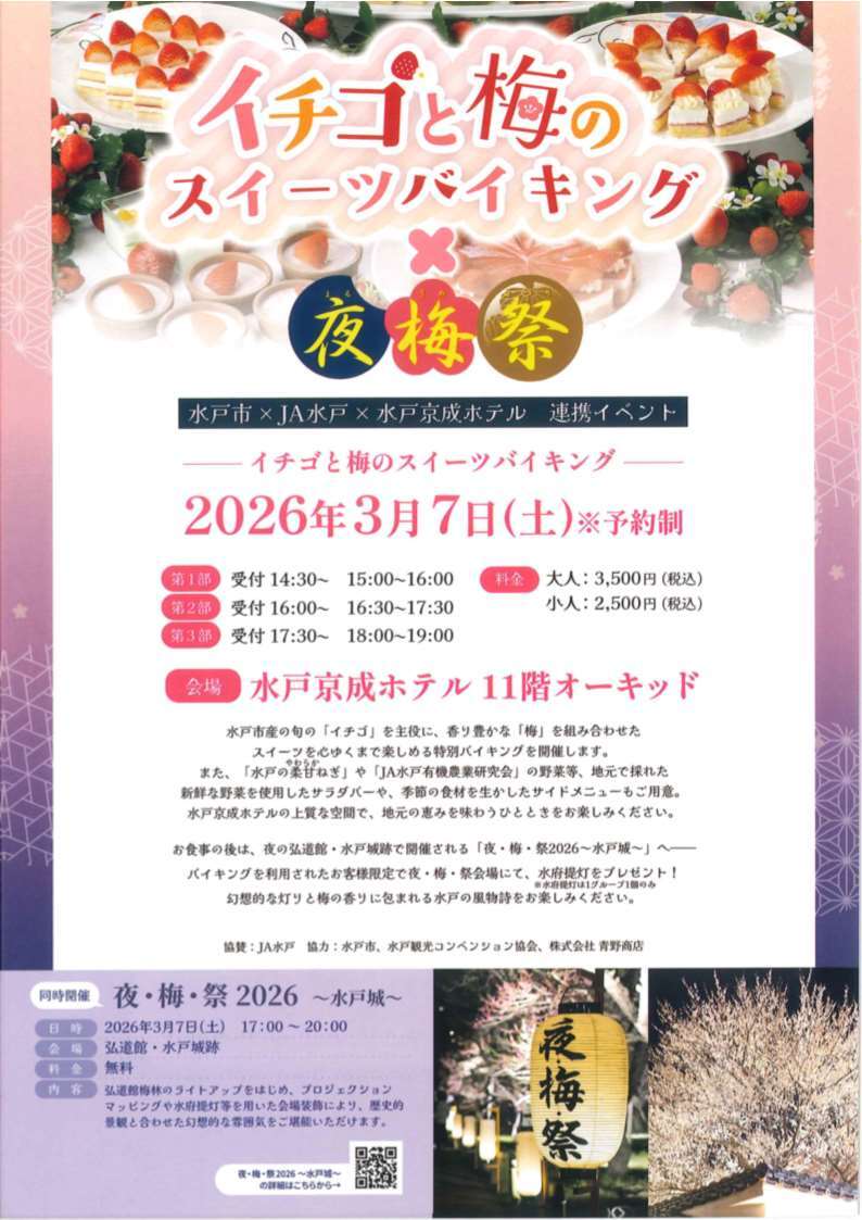 【3月7日】水戸市×JA水戸×水戸京成ホテル連携イベント 水戸市産の旬の「イチゴ」を主役に,香り豊かな「梅」を組み合わせたスイーツを心ゆくまで楽しめる特別なバイキングを水戸京成ホテルで開催します!(2026/02/17)