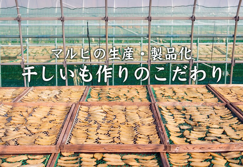 当社の干しいもは、主に提携農家さんが作っています。原料であるサツマイモの生産から、干しいも製造・販売に至るまで、すべて農家さんの手作りです。余計なものは何も加えず、太陽の力と風の力、そして熟練の技によって作る昔ながらの自然食品。干しいも一枚一枚に個性があり、食べるたびに違った味や食感が楽しめる商品となっておりますので、ぜひご賞味ください。