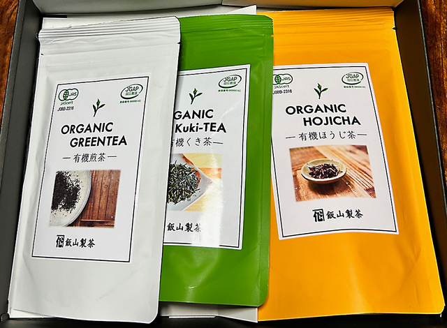 商品名:飯山製茶【有機栽培オーガニックの茶セット(煎茶80g、くき茶100g、ほうじ茶100g)】