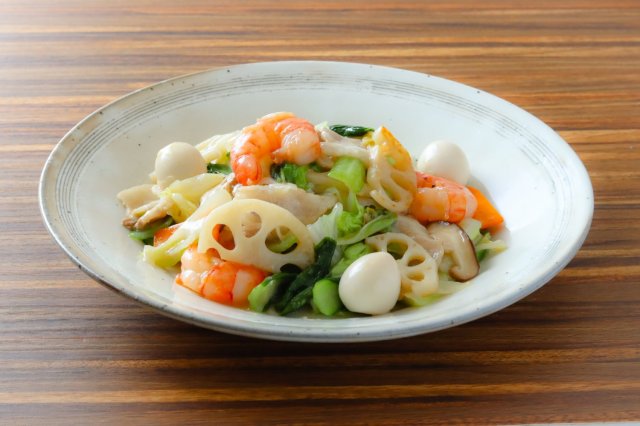 同じフライパンに油大さじ1を熱し、1のれんこんを炒め、火が通ったら、1の白菜・チンゲン菜・ねぎ・しいたけ・にんじんを加えてさらに炒める。