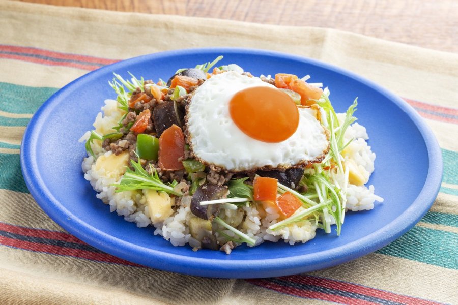 フライパンにオリーブ油を熱し、たまねぎ、にんにく、挽き肉を入れて中火で炒める。なす、ピーマン、トマトを加え、塩、こしょうで味をととのえる。