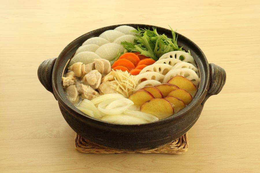 鶏肉はひと口大に切る。大根、れんこん、さつまいもは7~8㎜幅の輪切り、または半月切りにする。玉ねぎは12等分のくし形切りにする。水菜は4cm長さに切り、にんじんは7~8㎜幅の輪切りにする。