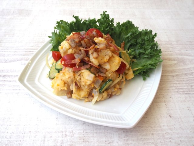 れんこんは皮つきのままよく洗い、5mmの角切りにして、水にさらして水気をきる。ベーコンは、5mm幅の細切りにする。